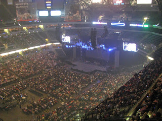 Only $5 to park and we headed into Conseco, past all the crazies who had been lined up to 'meet' the Idols since God knows when. One woman we passed on the stairs, who had to be at least 35 said, "Adam Lambert rocks my world!" I said, (to Brianna, of course, because far be it from me to start something in a crowd of Indiana Glamberts), "Too bad he's gay." Yes, I realize she may have only been speaking of his music, but I doubt it. What I wanted to do was stand in that crowd and yell, "None of y'all are turning him!" Anyway...